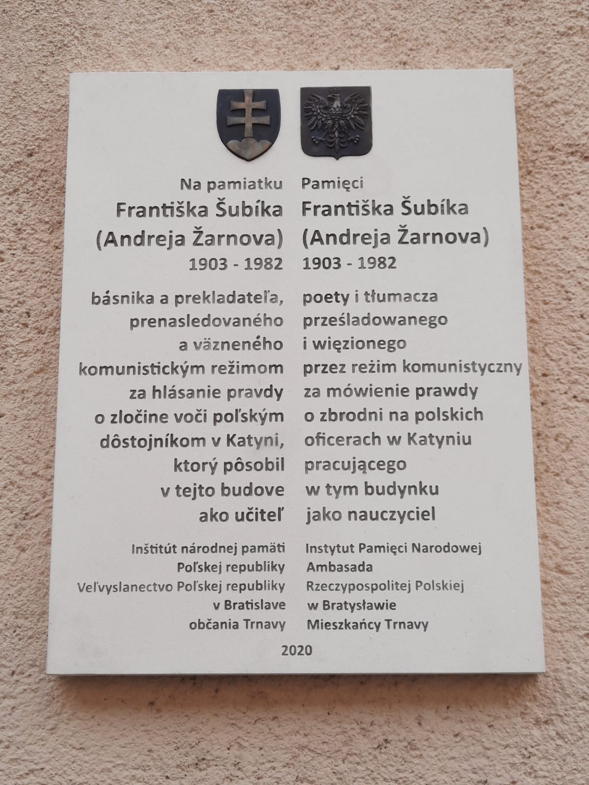 Tablica upamiętniająca prof. Franciszka Subika, słowackiego świadka Zbrodni Katyńskiej, członka Międzynarodowej Komisji Lekarskiej. Po zakończeniu II wojny światowej został aresztowany i osadzony w więzieniu za głoszenie prawdy o Zbrodni Katyńskiej. W 1952 uciekł z Czechosłowacji i do końca życia pozostał na emigracji.