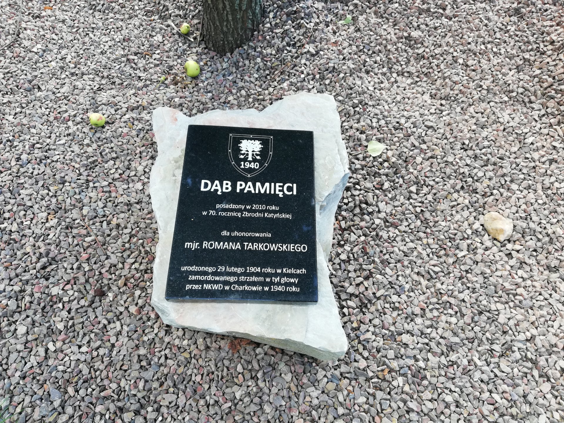 Kamień pamięci z inskrypcją przed Dębem Katyńskim ku pamięci mjr. Romana Tarkowskiego