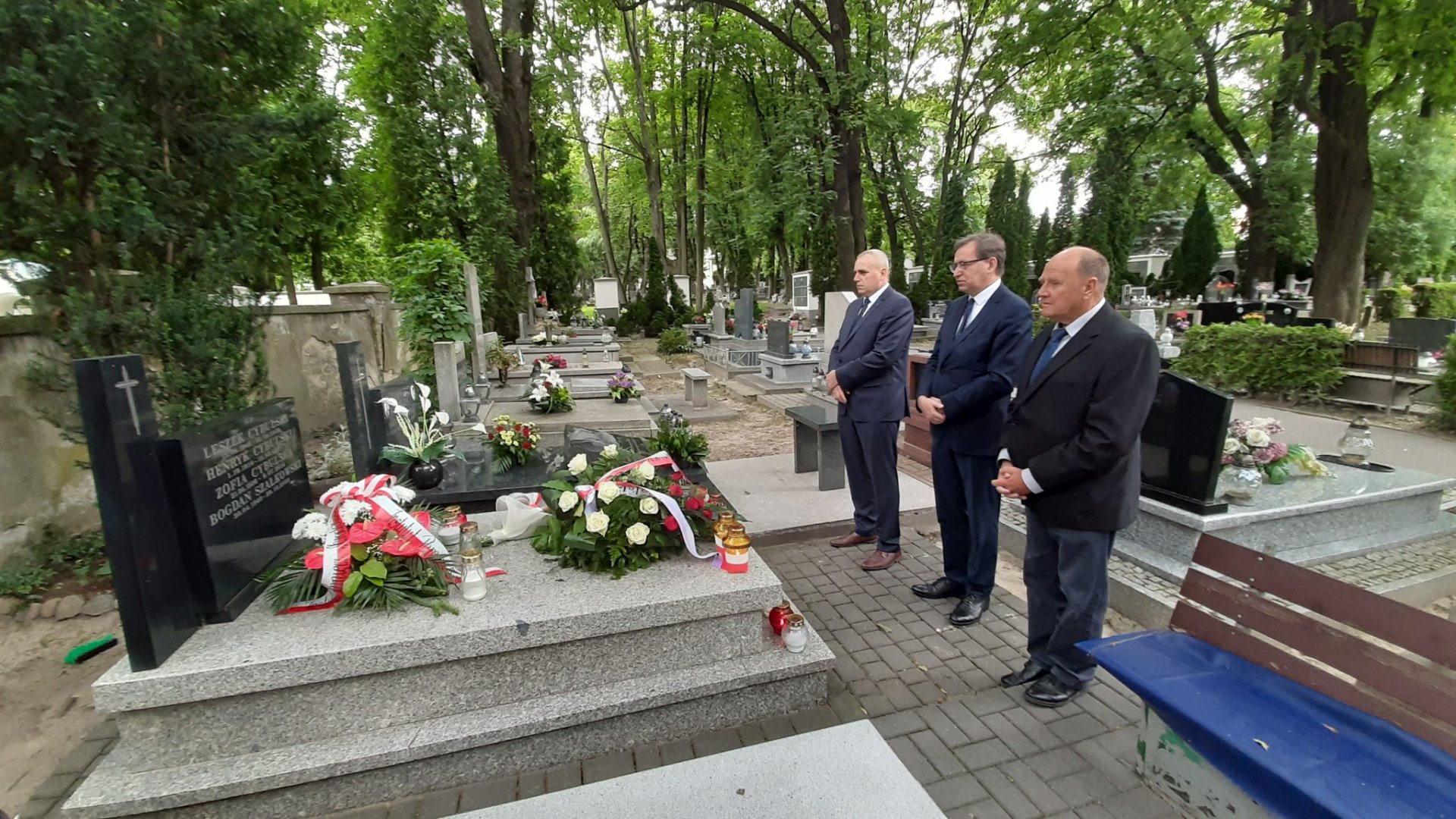 Prezes IPN Jarosław Szarek, dyr. OIPN Lublin Marcin Krzysztofik i Zdzisław Koguciuk, przedstawiciel rodzin ofiar Zbrodni Wołyńskiej zapalili znicze na grobie Henryka Cybulskiego z AK, komendanta samoobrony Przebraża. Fot. Dawid Florczak (IPN) -